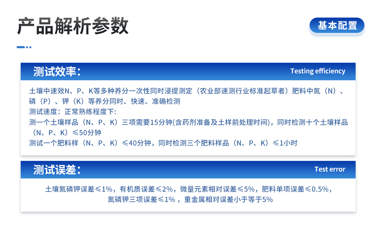 | 土壤中速效N、P、K等多種養分一次性同時浸提測定(農業部速測行業標準起草者)。 | 肥料中氮(N)、磷(P)、鉀(K)等養分同時、快速、準確檢測。 | 測試速度:正常熟練程度下: | 測一個土壤樣品(N、P、K)三項需要20分鐘(含藥劑準備及土樣前處理時間),同時檢測三個土壤樣品(N、P、K)≤40分鐘,同時測8個土樣≤1小時。 | 測試一個肥料樣(N、P、K)≤50分鐘,同時檢測三個肥料樣品(N、P、K)≤1.5小時。 |